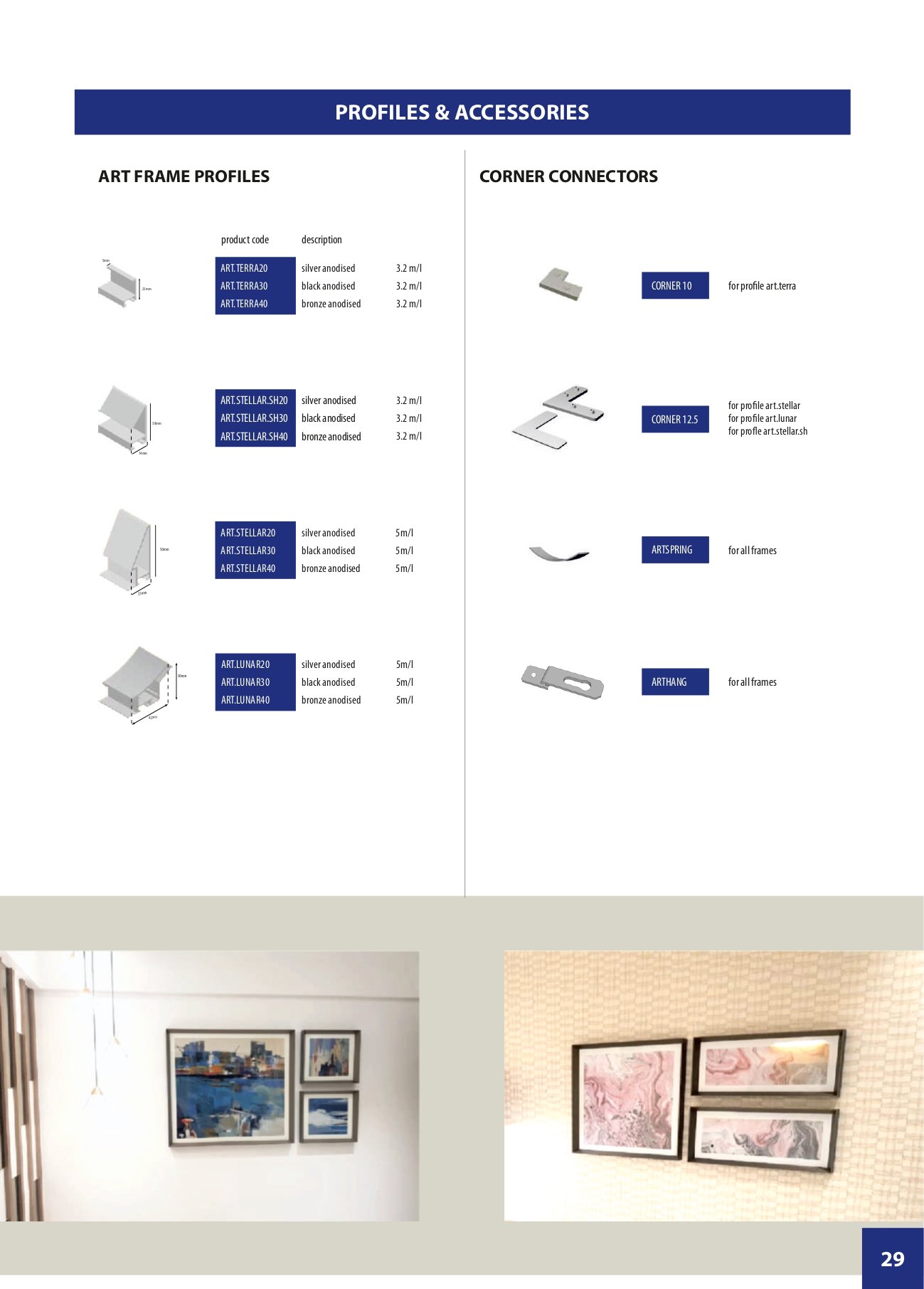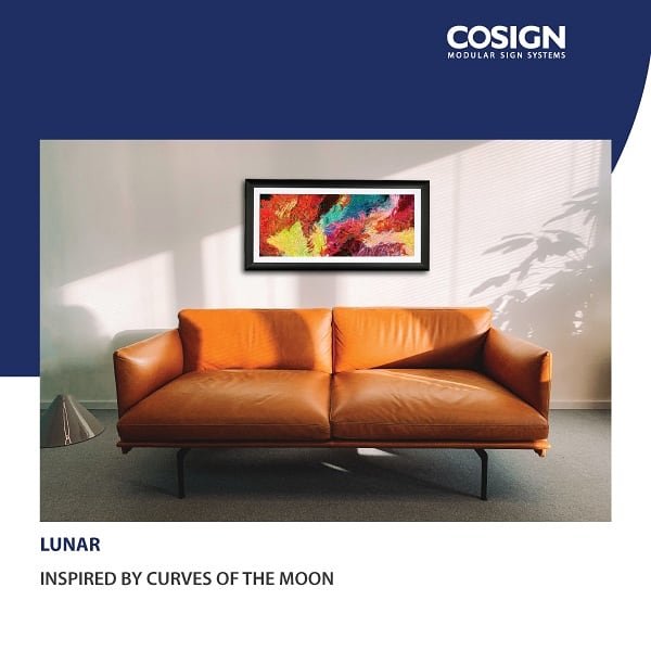 The Cosign art frames are a popular solution for installation of painted or printed canvas. Made of aluminium these frames are light weight. Metallic finishes in different shapes compliment all kinds of architectural environments.