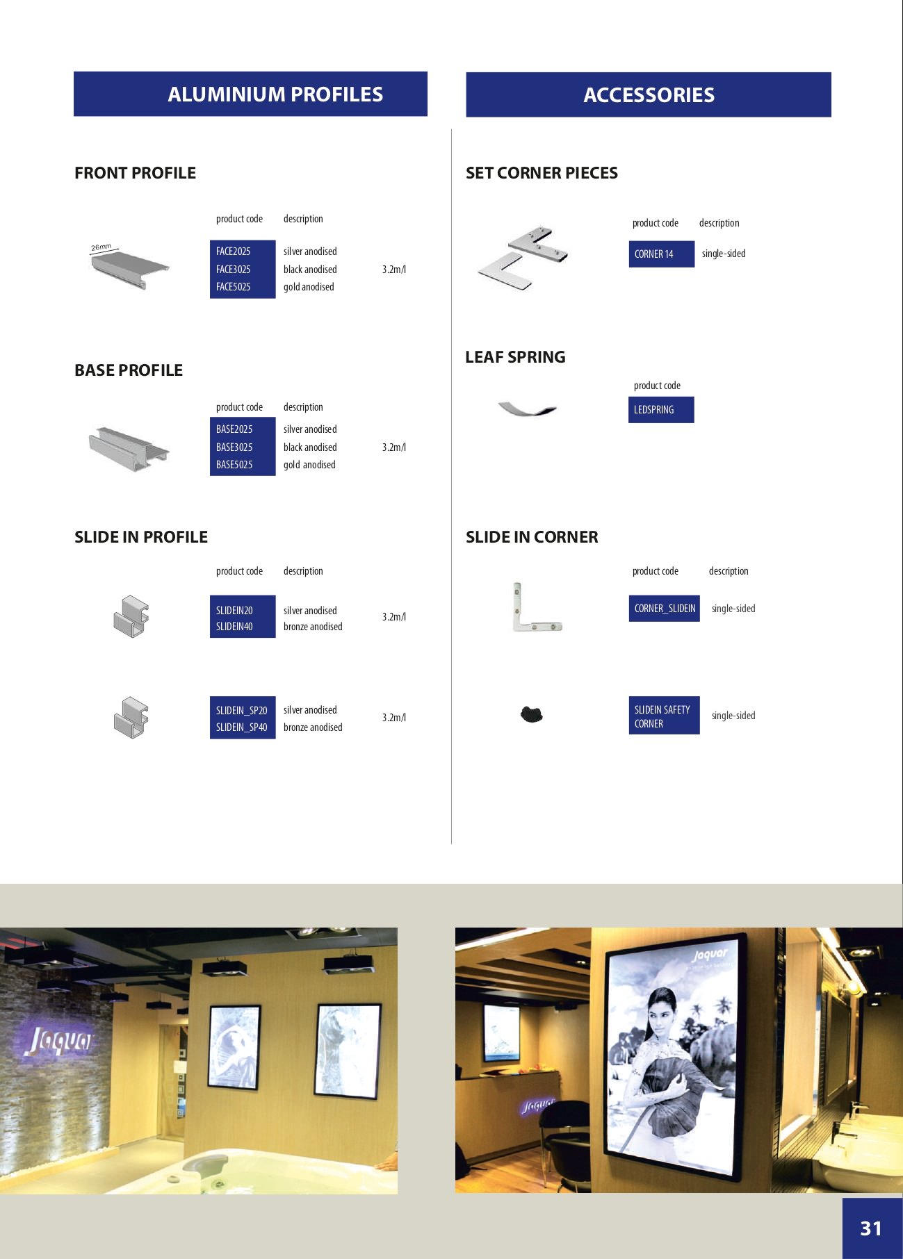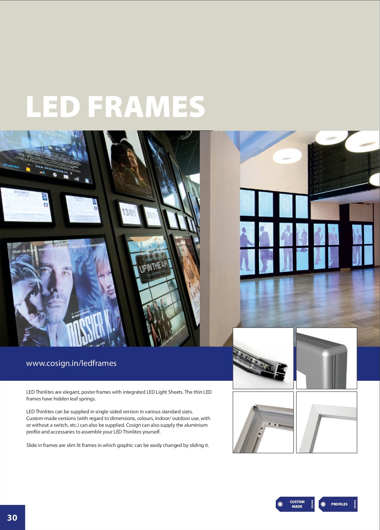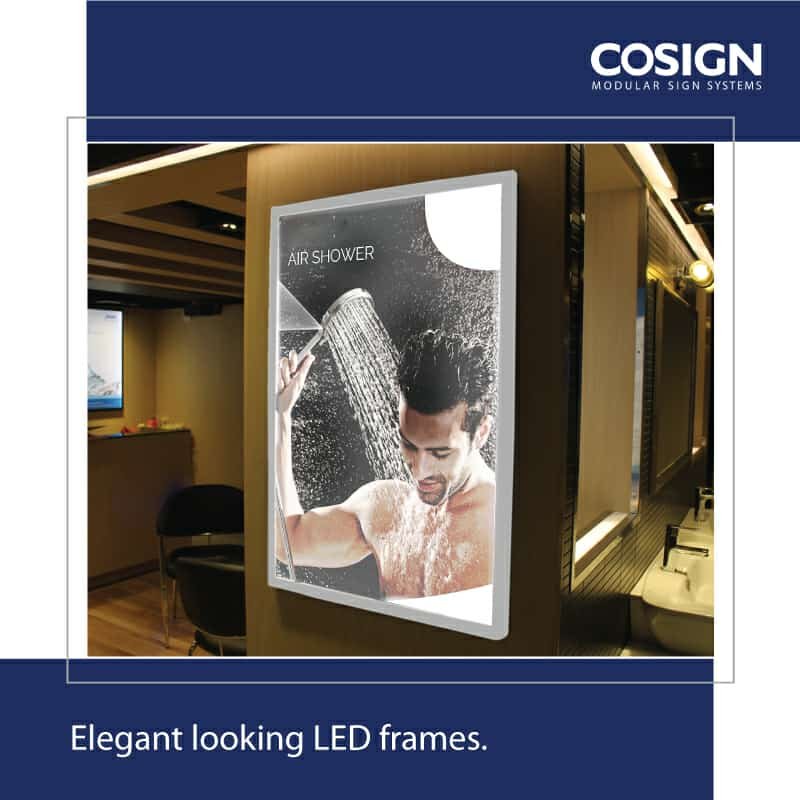 LED Thinlites can be supplied in single-sided versions in various standard sizes. Custom-made versions (with regard to dimensions, colours, indoor/ outdoor use, with or without a switch, etc.) can also be supplied. Cosign can also supply the aluminium profile and accessories to assemble your LED Thinlites yourself. Slides in frames are slim lit frames in which graphics can be easily changed by sliding it.