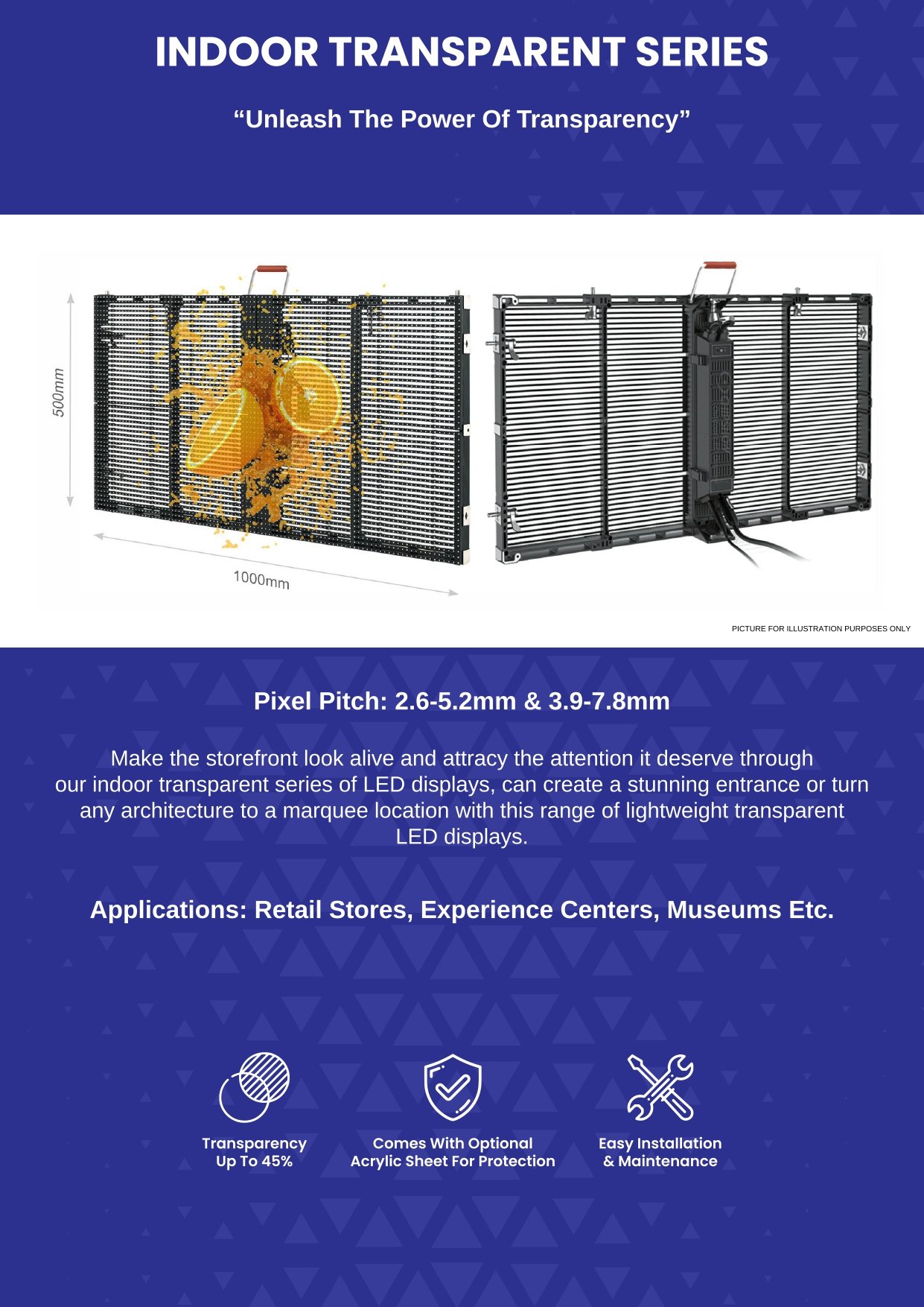The SMD LED Display is an excellent way to advertise products or a company’s identity through a vibrant LED screen, which offers vivid pictures and live broadcast of exciting events, sports as well as entertaining ceremonies. We have a wide range of SMD LED Displays, and it comes in P2, P3, P6, P8 and P10 variations of LED tiles. Moreover, we also have multi-colour and customized programming screens available with us.