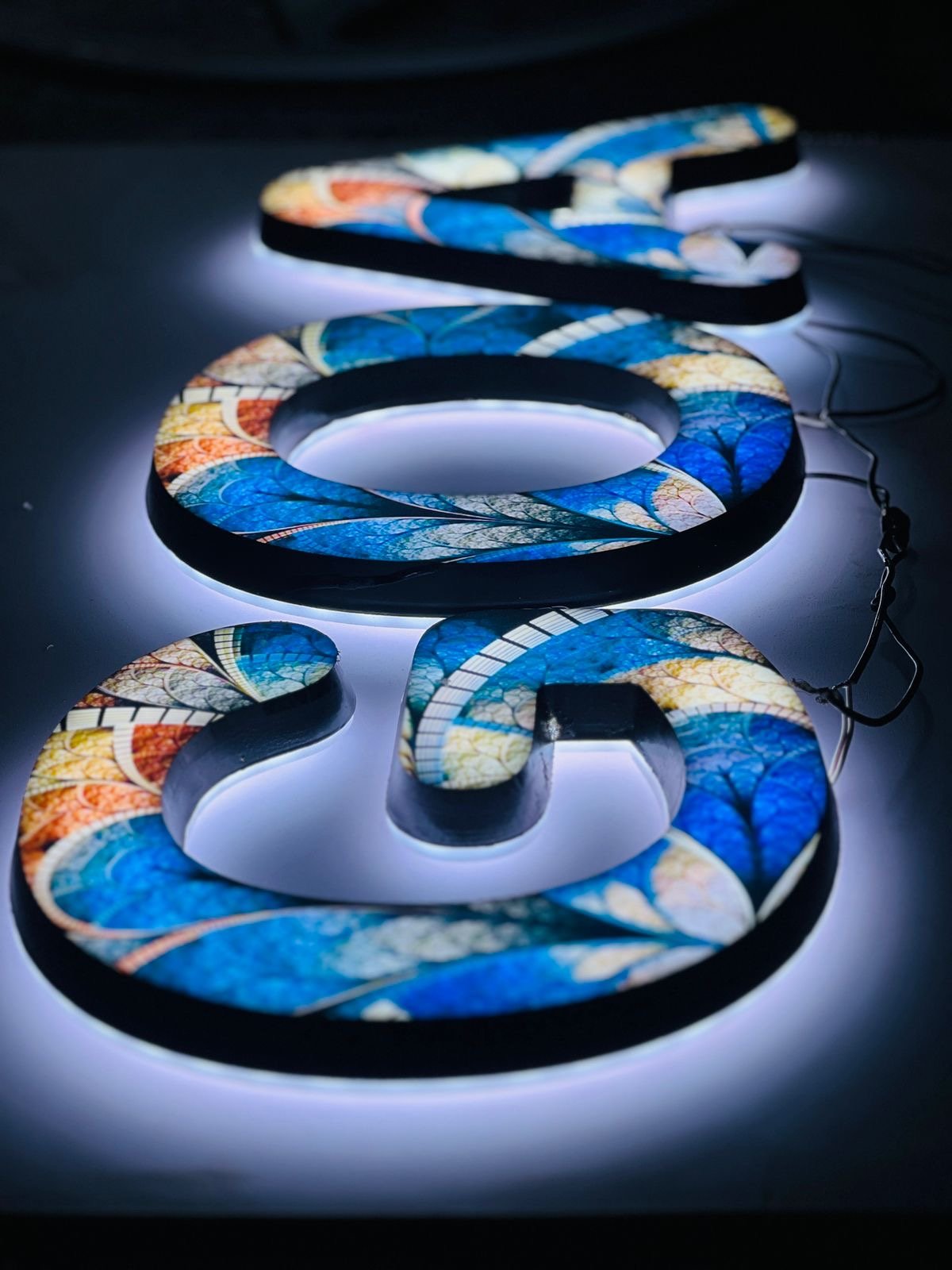 For Sizes smaller than 6 inches & letter health that does not permit channel raising we go for 20 mm solid block letters engraved and fitted with LED strips with desired colours with or without UV print coat on Top and difusion modrated on sides with PU paint coat.