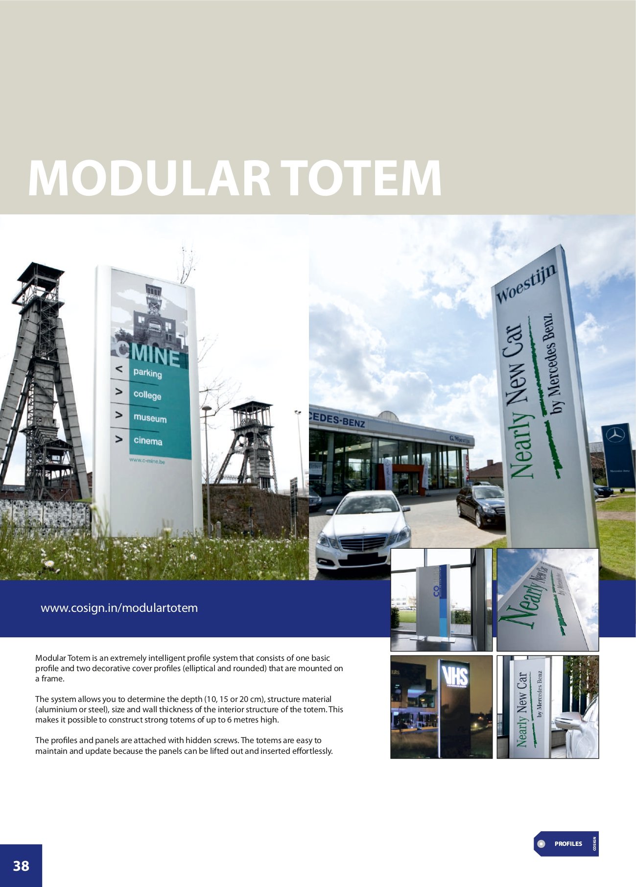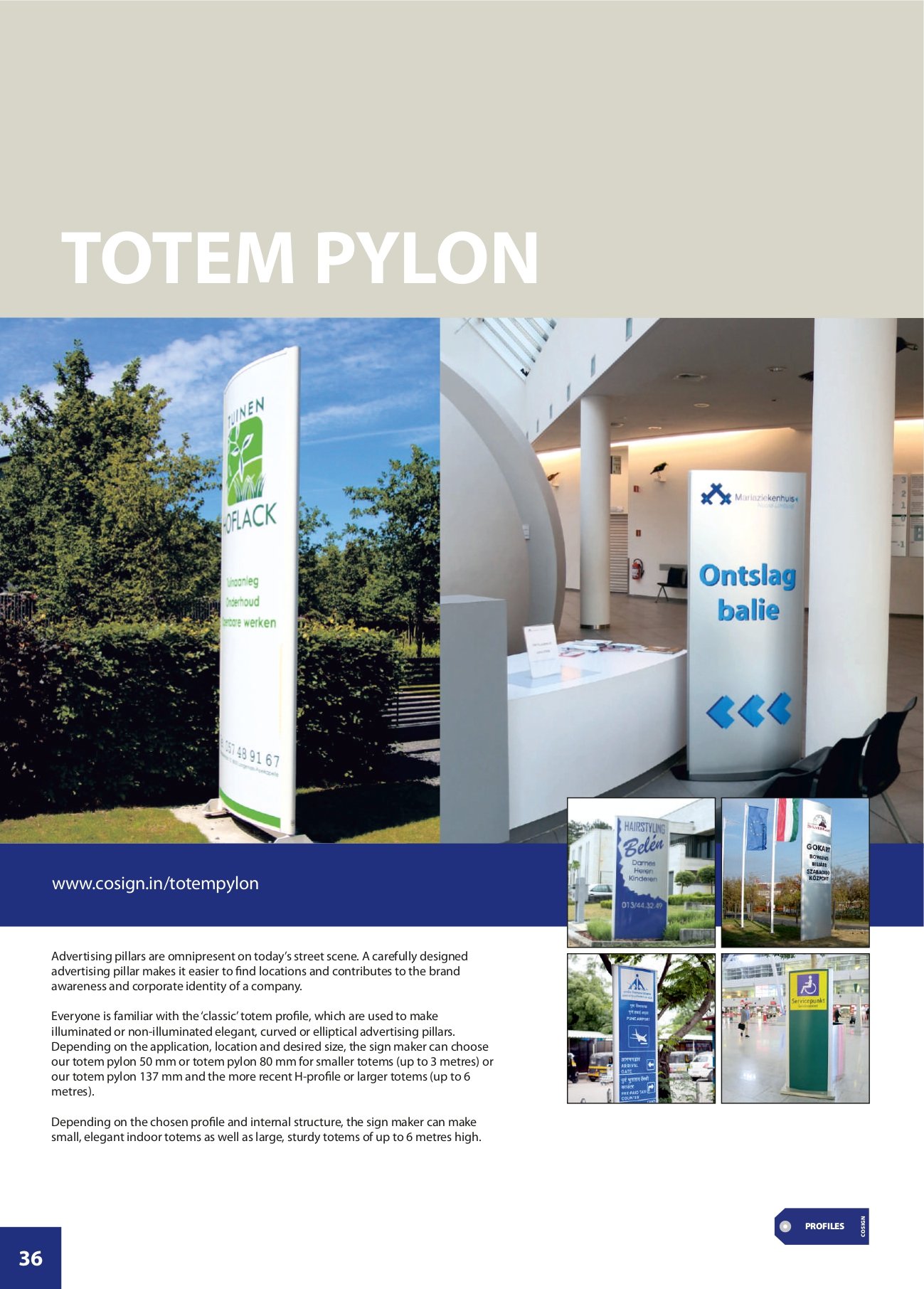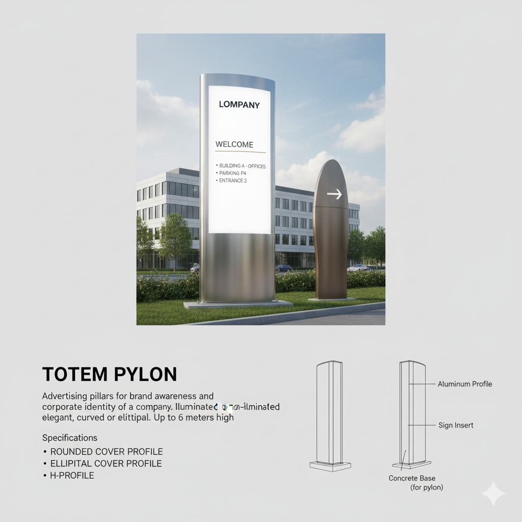 Illuminated or non-illuminated elegant, curved or elliptical advertising pillars. Depending on the application, location and desired size, the sign maker can choose our totem pylon 50 mm or totem pylon 80 mm for smaller totems (up to 3 metres) or our totem pylon 137 mm and the more recent H-profile or larger totems (up to 6 metres). Depending on the chosen profile and internal structure, the sign maker can make small, elegant indoor totems as well as large, sturdy totems of up to 6 metres high.