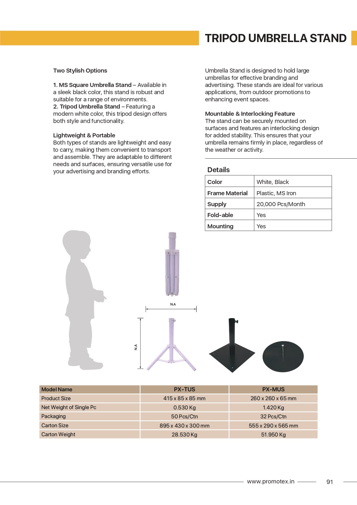 Umbrella Stand is designed to hold large umbrellas for effective branding and advertising. These stands are ideal for various applications, from outdoor promotions to enhancing event spaces. Mountable & Interlocking Feature The stand can be securely mounted on surfaces and features an interlocking design for added stability. This ensures that your umbrella remains firmly in place, regardless of the weather or activity. Two Stylish Options 1. MS Square Umbrella Stand – Available in a sleek black color, this stand is robust and suitable for a range of environments. 2. Tripod Umbrella Stand – Featuring a modern white color, this tripod design offers both style and functionality. Lightweight & Portable Both types of stands are lightweight and easy to carry, making them convenient to transport and assemble. They are adaptable to different needs and surfaces, ensuring versatile use for your advertising and branding efforts.